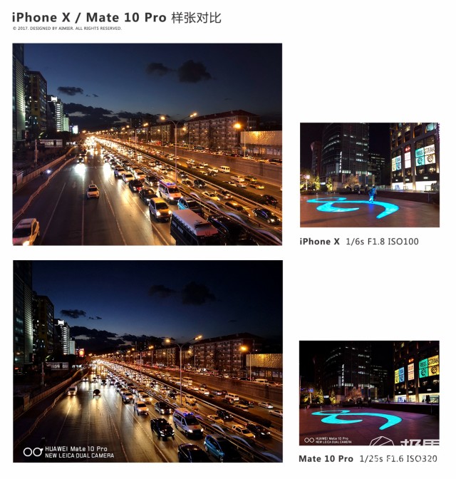 夜景条件下,两台手机的表现非常稳定,无论是曝光、色彩、防抖还是噪点控制都很出色,毕竟是强强对决嘛。要说差异,Mate 10 Pro的动态范围表现更好,抑制住了画面高光部分,没有iPhone X成像中的过曝迹象。